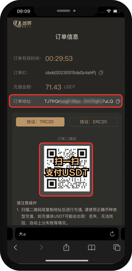 2、复制USDT付款地址或手机扫描付款二维码,去数字钱包支付。