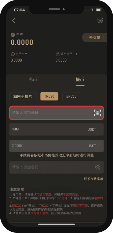 5、选择"USDT协议",将您在UED体育充值页面复制的收款地址,粘贴至"提币地址" 或使用"扫描付款码"输入数量,点击提币,充值后您的UED体育账户会成功到账等额人民币,即可进行游戏。